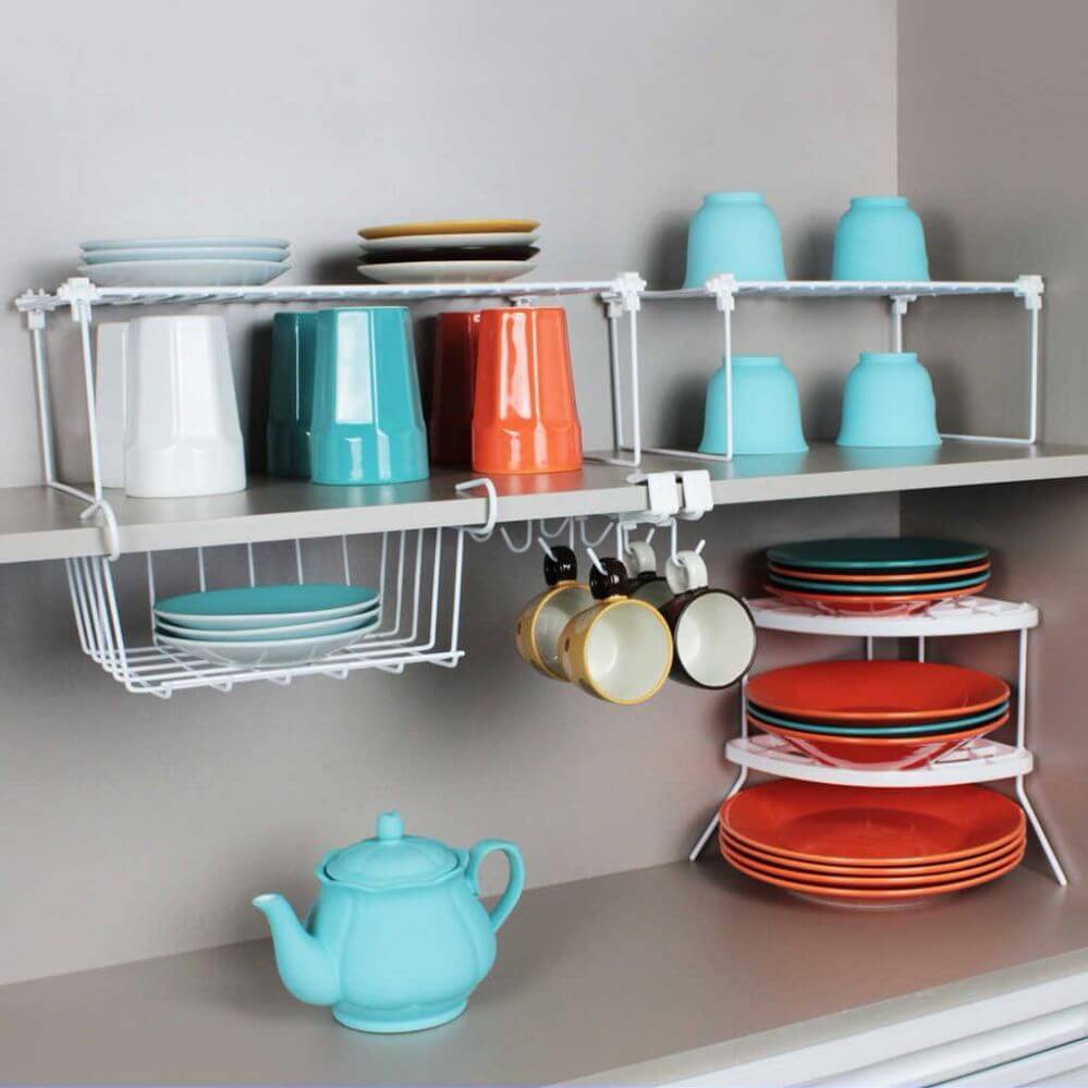 Небольшие этажерки, подвесные полочки и подставки помогут организовать хранение тарелок, чашек. С ними даже небольшое пространство получится использовать максимально эффективно. Плюс создать уют.