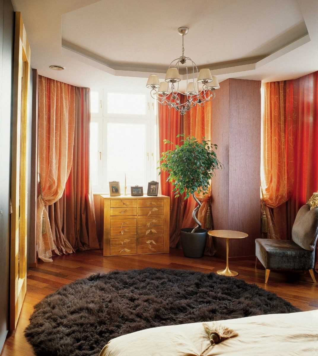 Оранжевые шторы в спальню достаточно плохо сочетаются с другими яркими оттенками, в том числе с красным или желтым.