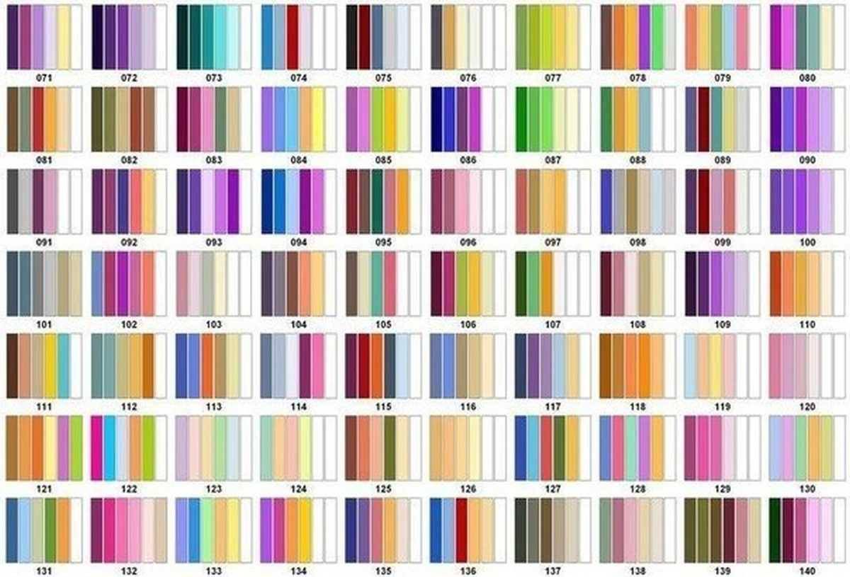 В подобных таблицах ищите на первой позиции оттенок, который вы хотите сделать преобладающим. Постаравшись, можно найти от трех и более вариантов. Ведь есть таблицы, которые составлены по контрастному, комплиментарному и т.д. принципам. Так что вариантов немало. Например, в приведенном выше куске таблиц (на самом деле таких листов очень и очень много) для ярко-синего есть две комбинации: 127 и 135. На других листах их будет еще больше. Из найденных вариантов выбираете то сочетание цветов в интерьере, которое вам больше импонирует.
