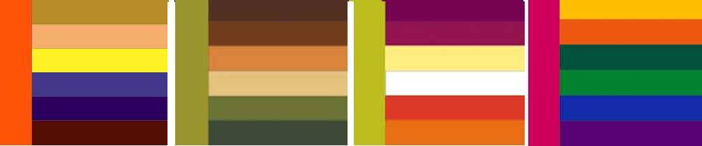 Есть таблицы, которые имеют другой вид: у них доминирующий оттенок расположен перпендикулярно дополнительным и акцентным. Правила пользования таблицами сочетающихся цветов от этого не меняются. Только основной цвет выделен, благодаря чему чуть проще ориентироваться.
