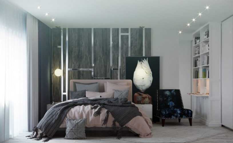 Нейтральная гамма – белая или серая спальня в скандинавском стиле оформления способствует ощущению легкости и спокойному отдыху в спальне. Кроме основных цветов, могут быть задействованы любые светлые и мягкие (пастельные) тона.