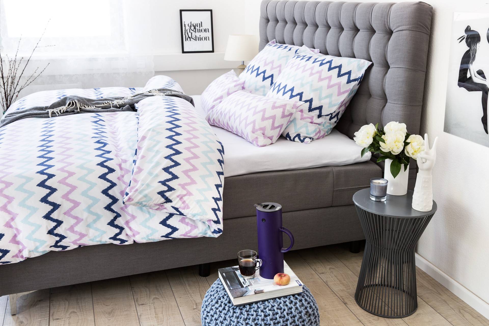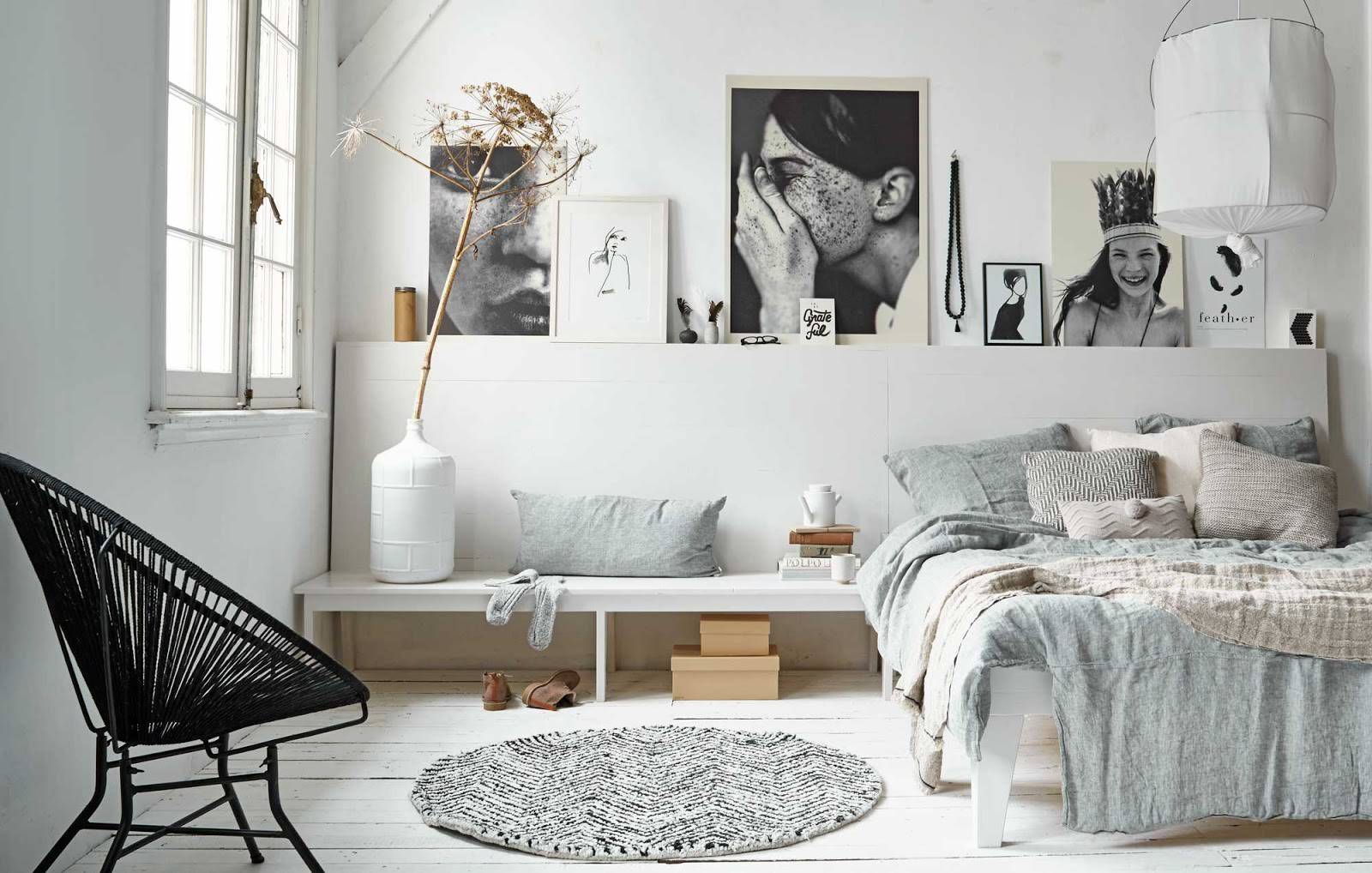 Скандинавские дизайнеры активно используют графический дизайн в оформлении. Яркие постеры, открытки и фотокартины украшают стены спальни.