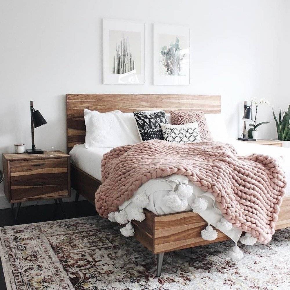 Небольшая уютная спальня также нуждается в дополнительных уютных акцентах. Положите на пол коврик — шерсть будет идеальной, но более дешевый акриловый материал также будет выполнять свои функции. Спальни в скандинавском стиле хорошо смотрятся с разнообразным дизайном, поэтому выбирайте напольные украшения с марокканским или геометрическим клеверным мотивом.