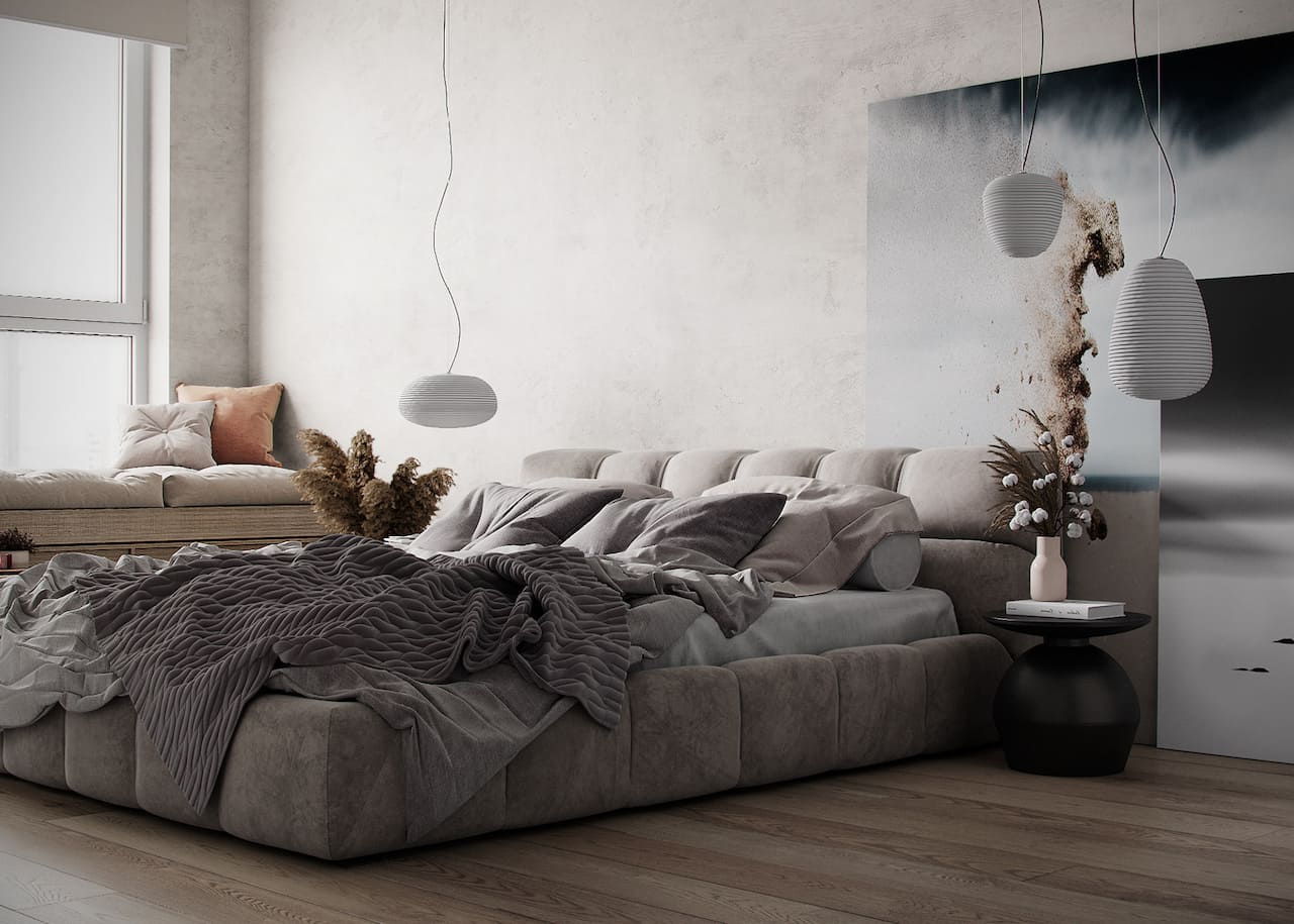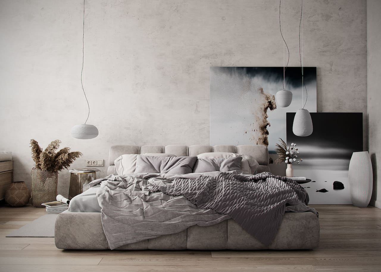 В спальне вообще и в скандинавской в частности не расставляют большое количество декора. Во-первых, все эти милые безделушки отвлекают от отдыха, а, во-вторых, нещадно собирают пыль.