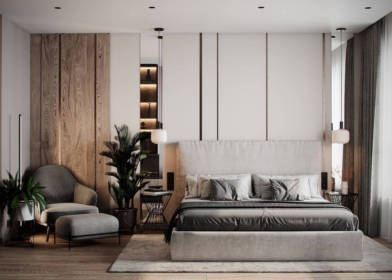Нейтральные оттенки гармонично сочетаются в дизайне нордической комнаты. Светлый, почти белый, пепельный фон сделает спальню просторной. Стальные цвета уместны в акцентных поверхностях, в мебели и в декоре. Темный графитовый поможет привнести в интерьер границы.