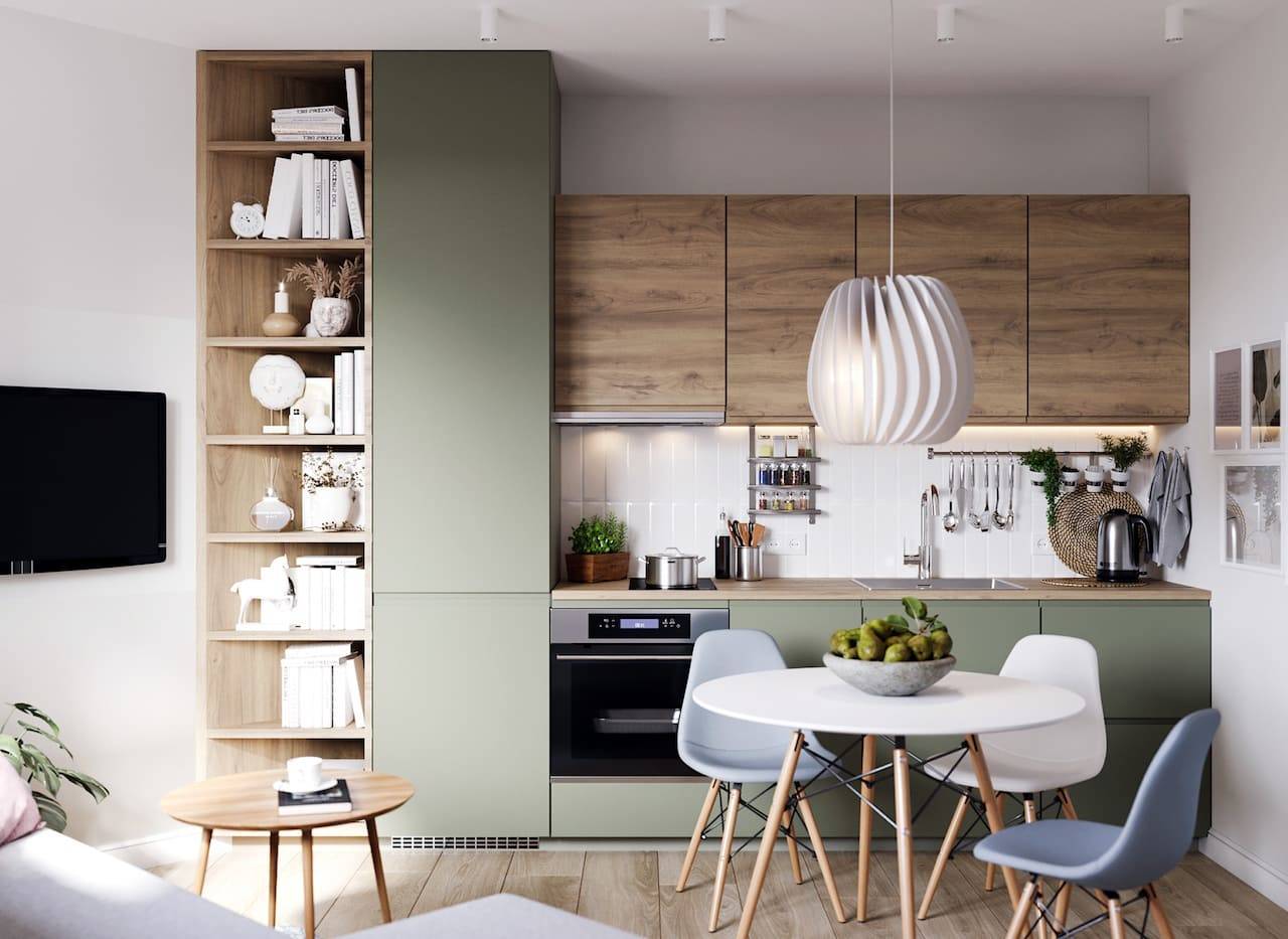Приятную, природную палитру в нордическом дизайне используют для создания настроения. Если комната темная, то в оформлении уместны серо-зеленый и светло-мятный. Свежие тона гармонично сочетаются с теплыми древесными на фасадах и на полу.