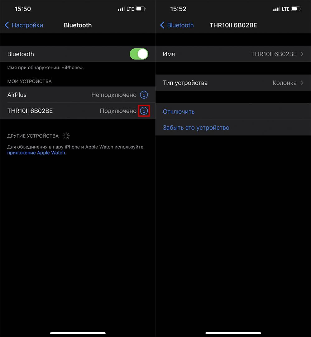 Бывает наоборот, отваливается колонка при подключении к Wi-Fi или мобильному интернету. Или вообще связь есть, а в динамике нет звука. В этом случае нет необходимости отключать беспроводное соединение. Зайдите в «Настройки» — «Bluetooth» — рядом с колонкой нажмите восклицательный знак. Затем в открывшемся окне сначала выберите «Отключить», а затем «Забыть это устройство». Отключаем колонки и пробуем снова их подключить одним из предыдущих способов.
