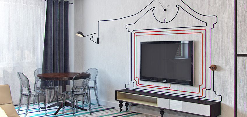 Интересным решением станет декорирование проводов и превращение в элемент интерьера. Их прячут за растениями, занавесками и т.д. или же делают частью дизайна стены с телевизором.