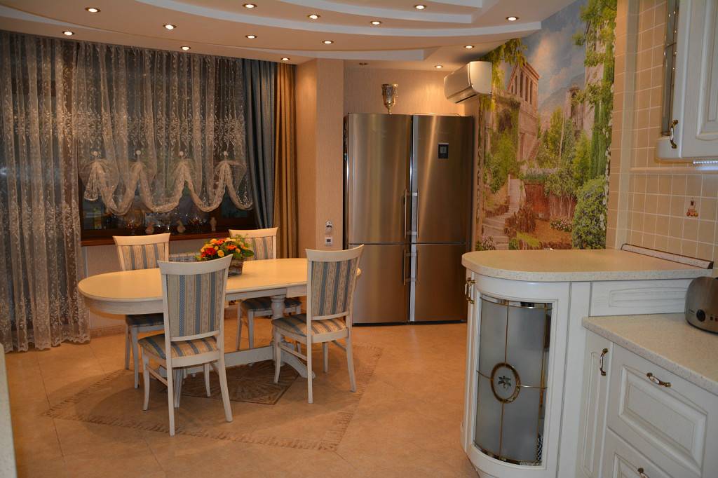 Кухня-студия в стиле неоклассика или комната с классическим дизайном, характеризуется светлыми бежевыми, светло-коричневыми, белыми или более насыщенными бордовыми оттенками. Элементы мебели, могут быть декорированы с помощью орнамента, резного декора, фацетных вставок или других украшений.