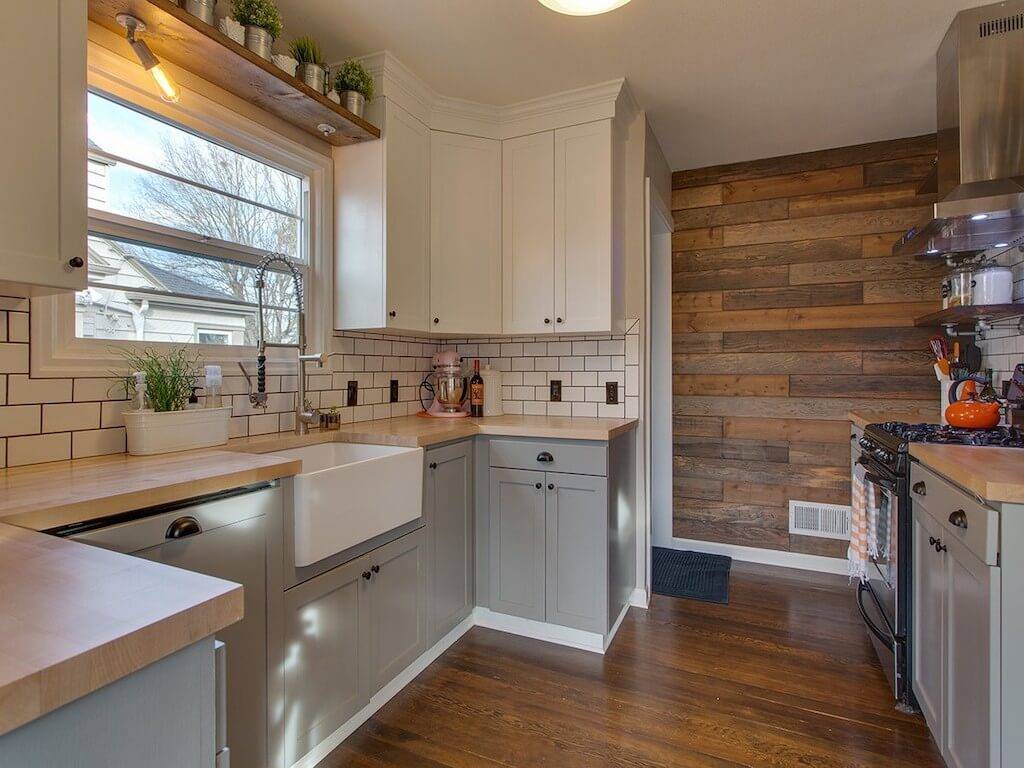 Этот проект кухни «серый низ — белый верх» с деревом в бревенчатом доме сложно назвать удачным, поскольку глаз цепляется за большое количество мелочей: тут и дерево трех разных видов, и выделяющиеся черные ручки, и белый цоколь, буквально режет пространство, а также разноцветная техника на противоположной стороне.