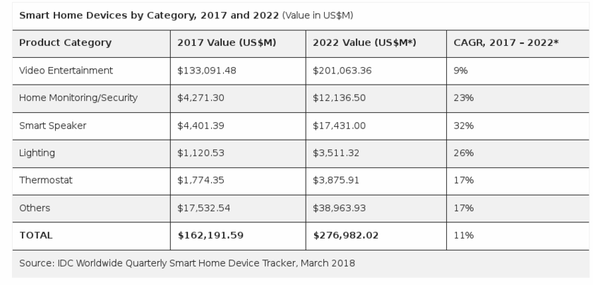 Самая обширная категория рынка устройств для «умного дома», на долю которой приходится примерно три четверти от суммарного объема в деньгах, — это системы видеоразвлечений, включая смарт-телевизоры, цифровые мультимедийные приставки и другие видеоустройства с возможностью подключения к интернет. По оценкам IDC, в 2017 году выручка в сегменте Video Entertainment составила более $133 млрд. Лидерами в подкатегории телевизоров в прошлом году были Samsung и LG Electronics, а ведущими производителями медиаадаптеров стали Amazon, и Roku.