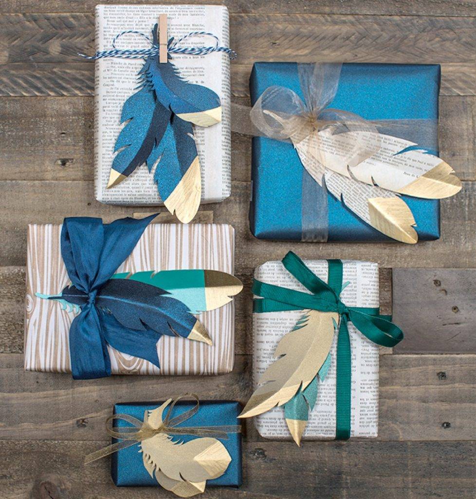 Чтобы придать упаковке подарка особый шик, достаточно дополнить декоративными перьями, их можно купить в специализированных магазинах. Такой элемент добавит упаковке легкости, тут главное не переборщить, иначе милая упаковка превратится в вульгарную.
