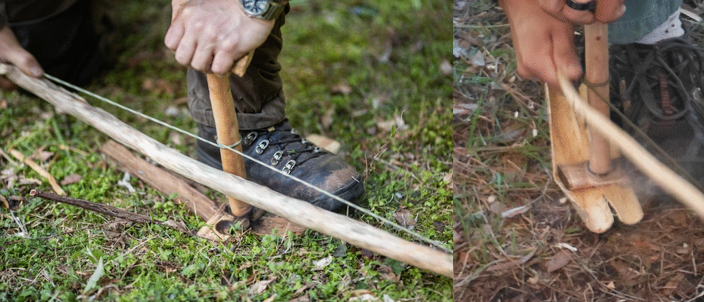 Зажигаем огонь. Когда вы заметите тлеющую древесину, нажмите на доску, чтобы тлеющие угли упали на положенный внизу трут в виде кусочка сухой коры