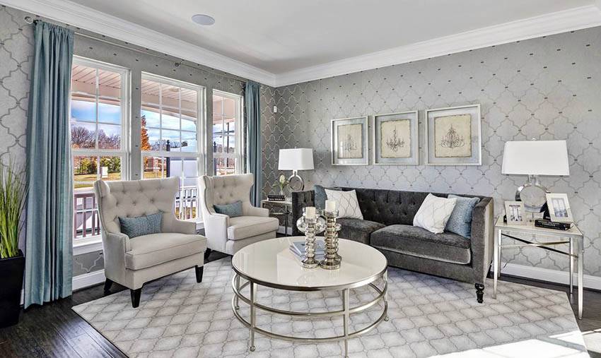 Использование серебра и металлов – наличие металлических цветов придает элегантность любому интерьеру. Металлическая листовая отделка обоев в приведенном ниже примере, придает более современное впечатление классическому четырехлистному рисунку и мгновенно придает роскошный вид. Используя освежающий синий цвет для акцентов и нейтральных тонов для мебели, «холодное» прикосновение обоев смягчается и дает более теплое ощущение пространства для интерьера гостиной.