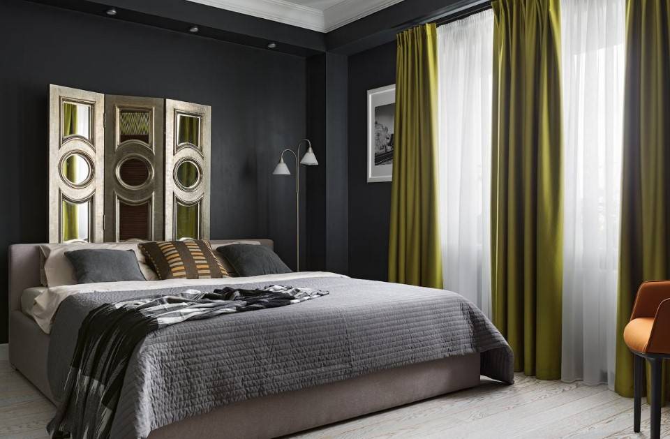 В интерьер прекрасно впишутся кровать, пара кресел и тумбочка. Пространство должно быть распределено так, чтобы можно было чувствовать себя в спальне свободно, не должно быть нагромождения мебели.
