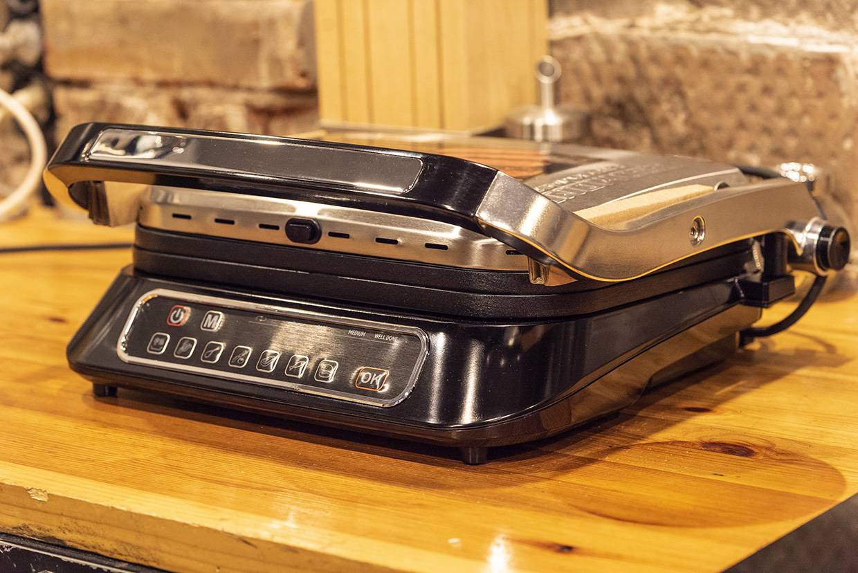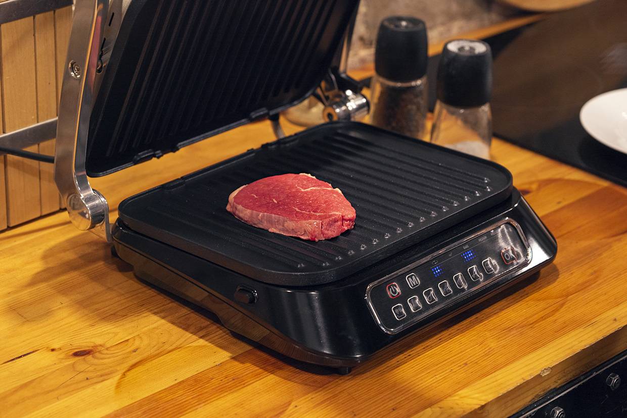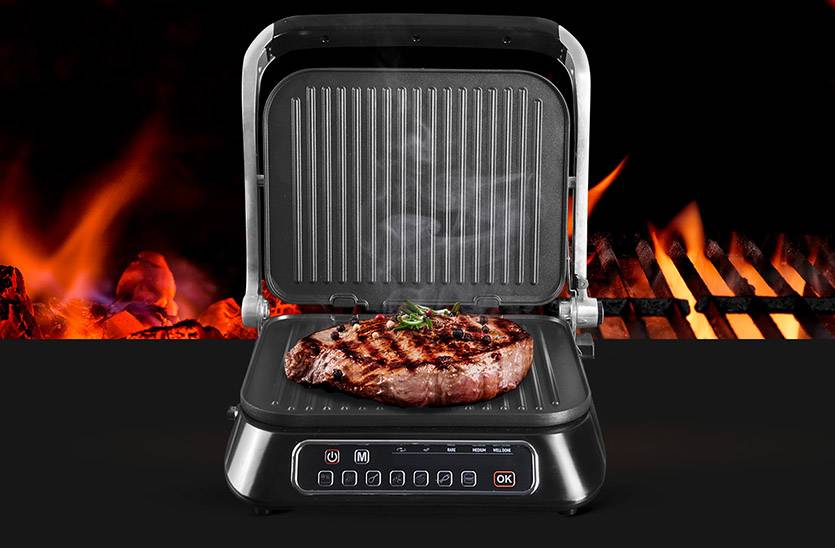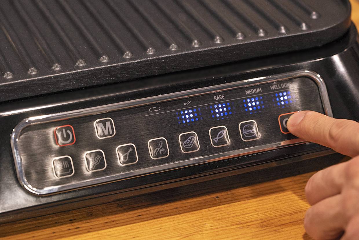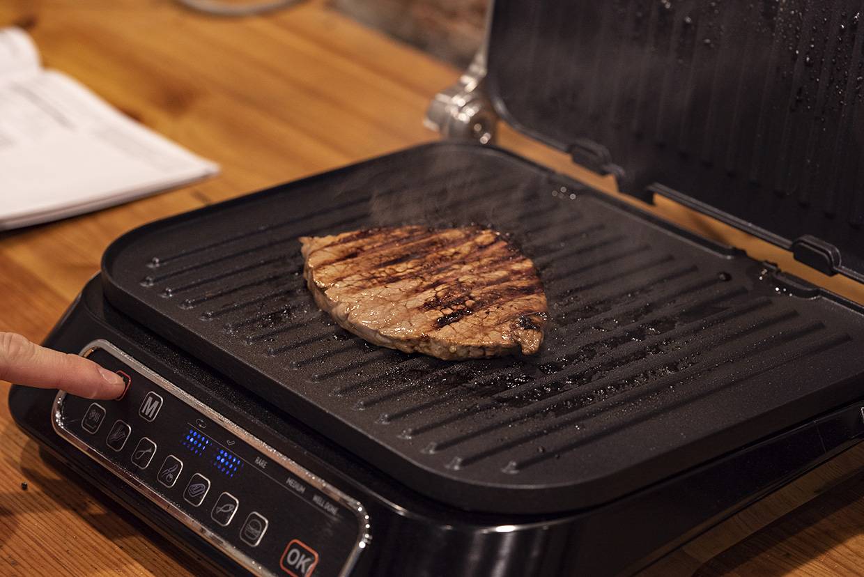Это настоящий мастер по стейкам: встроенный датчик автоматически измеряет толщину мяса. Исходя из этого гриль рассчитывает степень прожарки (видна на индикаторе).
