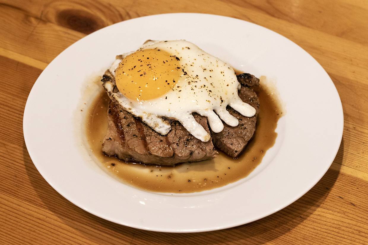 Через полторы минуты выложил яичницу прямо на мясо, разрезал и, не скрою, кайфанул.