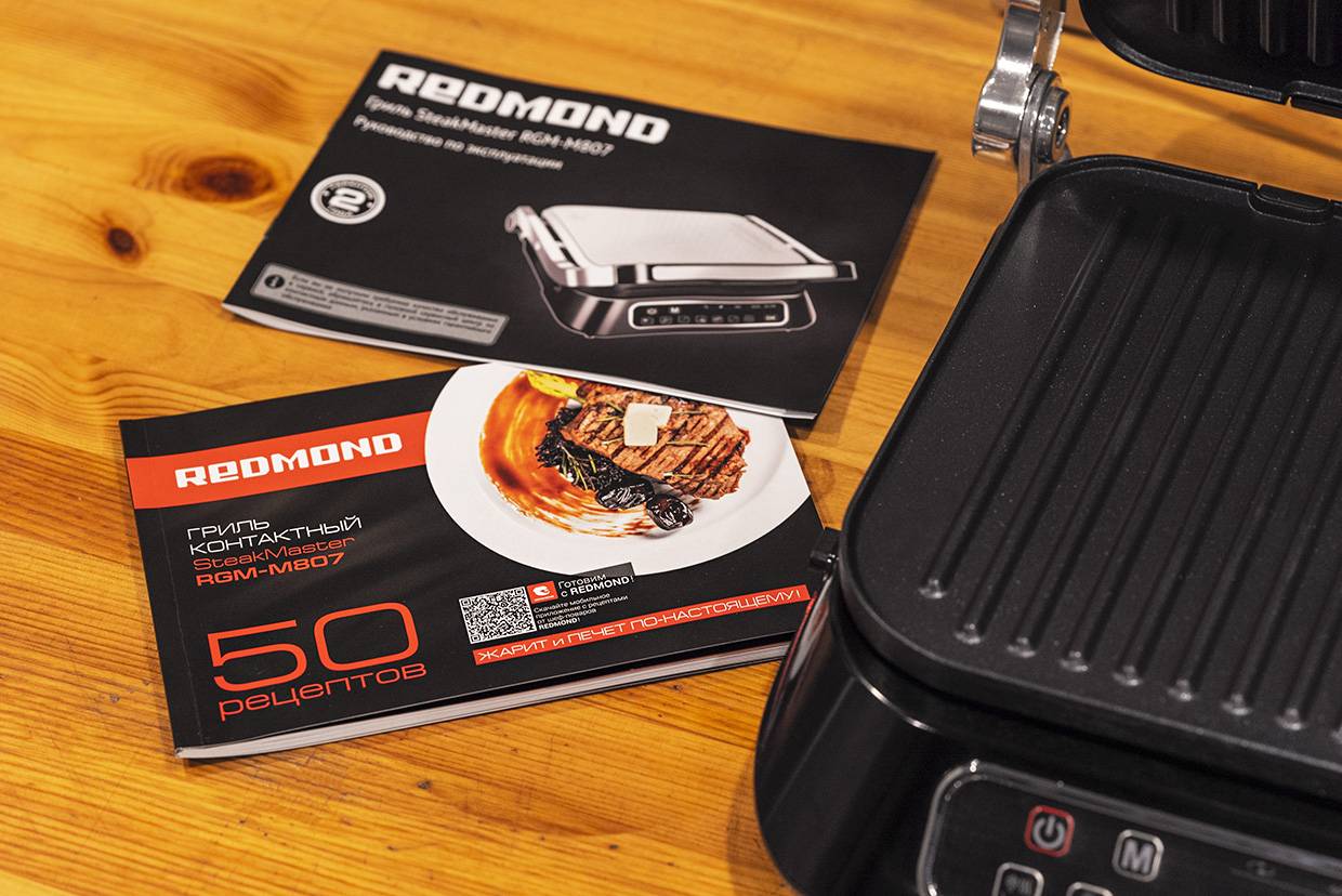 В комплекте с грилем есть книжка рецептов – обязательная фишка REDMOND. В ней подробно рассказан не только процесс подготовления продуктов, но и то, как настроить гриль для каждого из блюд.