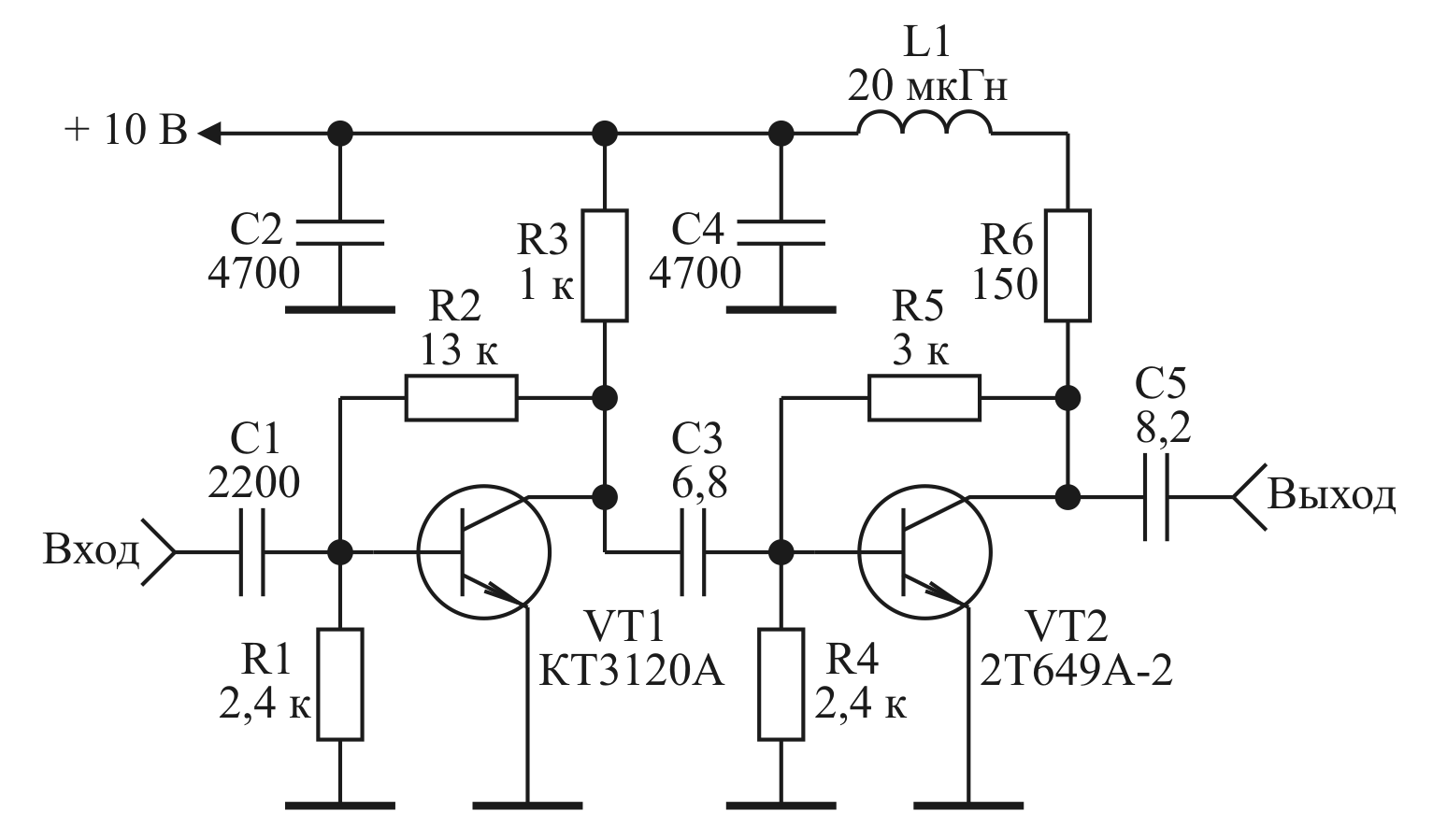 Теперь рассмотрим типовые транзисторные схемы, которые действительно являются широкополосными.