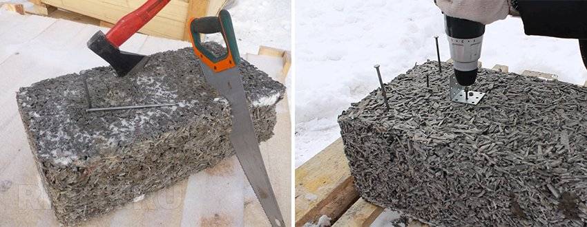 Легкость обработки. Арболит достаточно легко пилится, скрепляется саморезами и дюбелями без деформации.