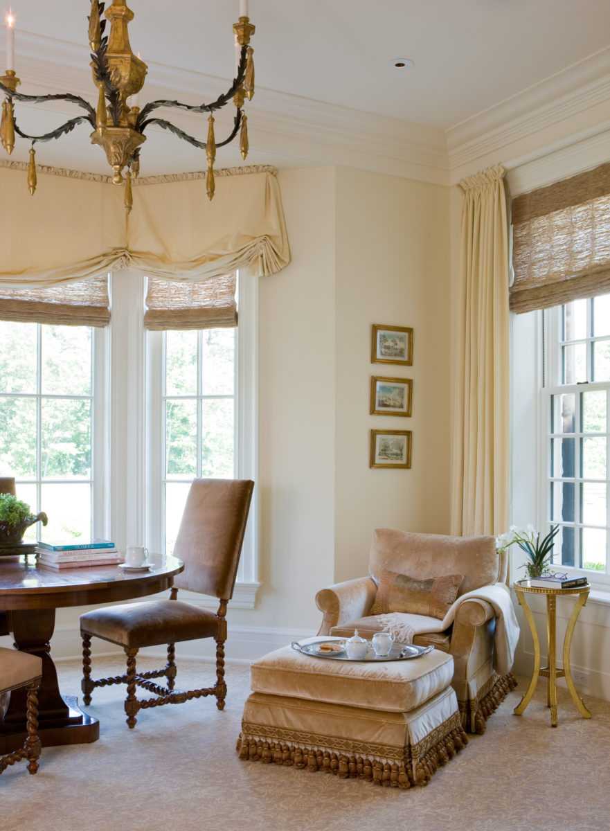 - Вешать занавески уместно, если помещение имеет большой метраж и качественное освещение. В идеале, потолки должны быть высокими, оконные проёмы – широкими, стеновая отделка выдержана в молочной гамме.