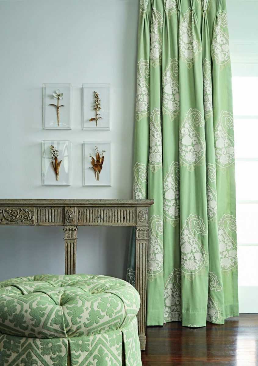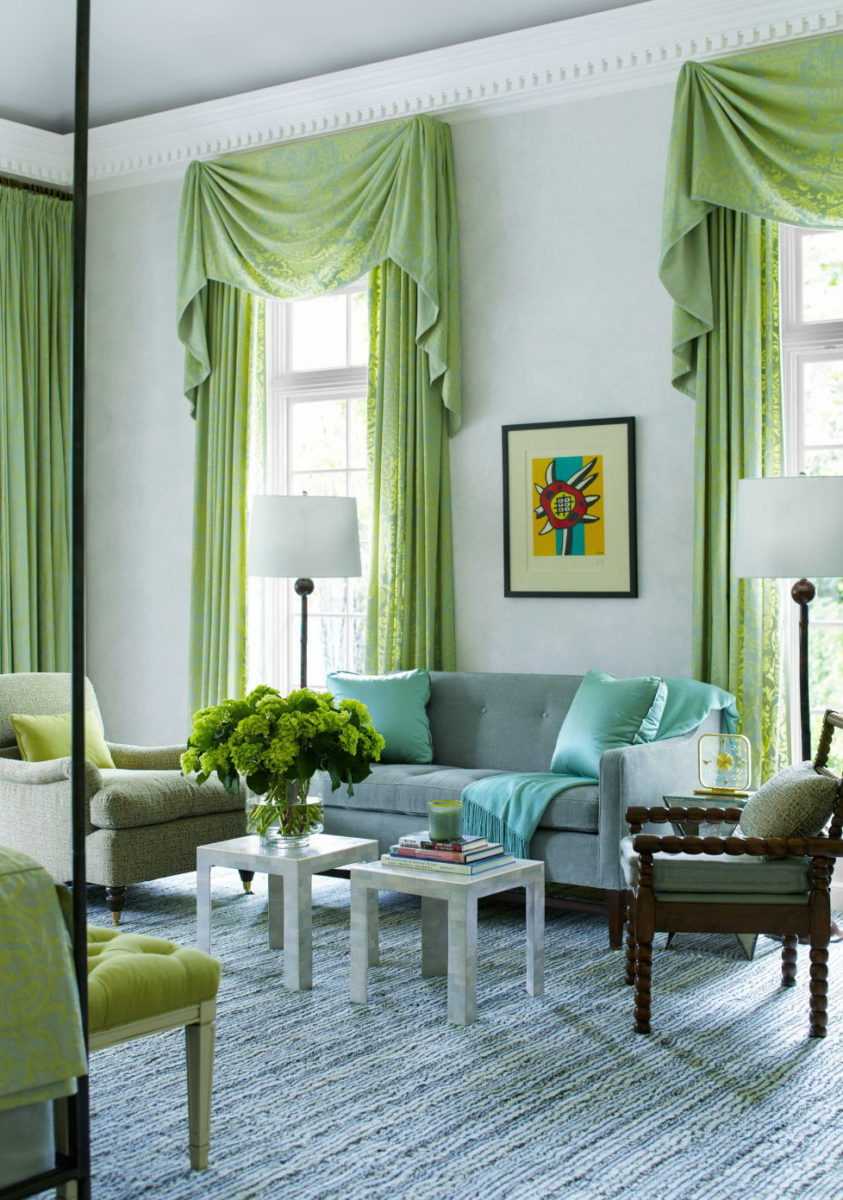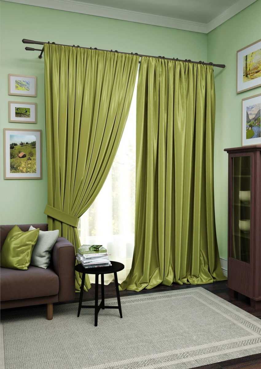Настенные покрытия зеленого цвета можно дополнить портьерами лимонного оттенкаИсточник арт-интерьер.москва