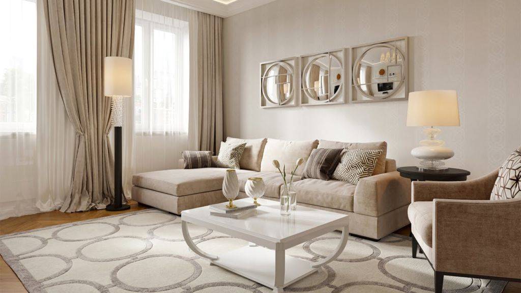 - Бежевые настенные покрытия универсальны, предоставляют широкий простор для выбора прочих предметов обстановки. Для создания уютного интерьера в этом случае хорошо подходят занавеси персикового, карамельного или молочного оттенка из плотной легкой ткани. Если же предполагается приобрести яркие шторы к светлым обоям, их «напор» потребуется смягчить воздушным тюлем.
