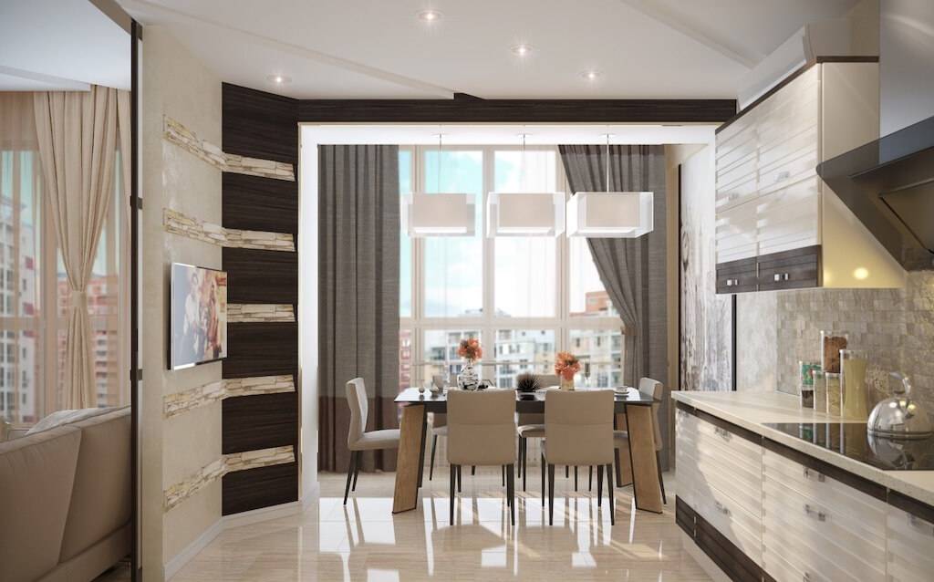 Балконная дверь в совмещенной кухне-гостиной часто оформляется римскими шторами. Но такое решение может быть не совсем комфортно, поскольку будет необходимость каждый раз поднимать и опускать шторку при желании выйти на балкон. Хотя сейчас есть варианты, которые крепятся прямо на створку.