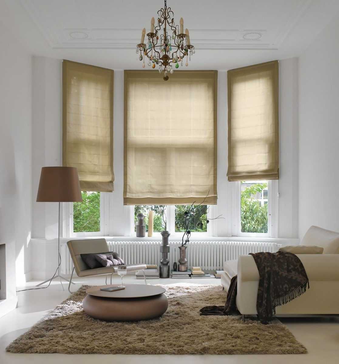 Светлый дизайн с простыми формами и натуральным наполнением. В скандинавском интерьере уместно будут смотреться рулонные и римские шторы.