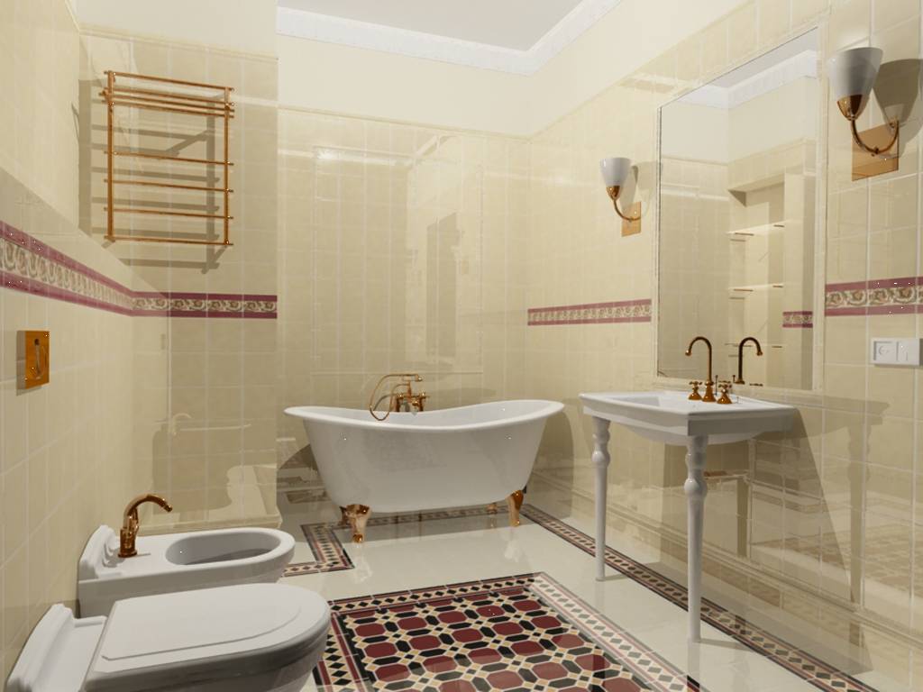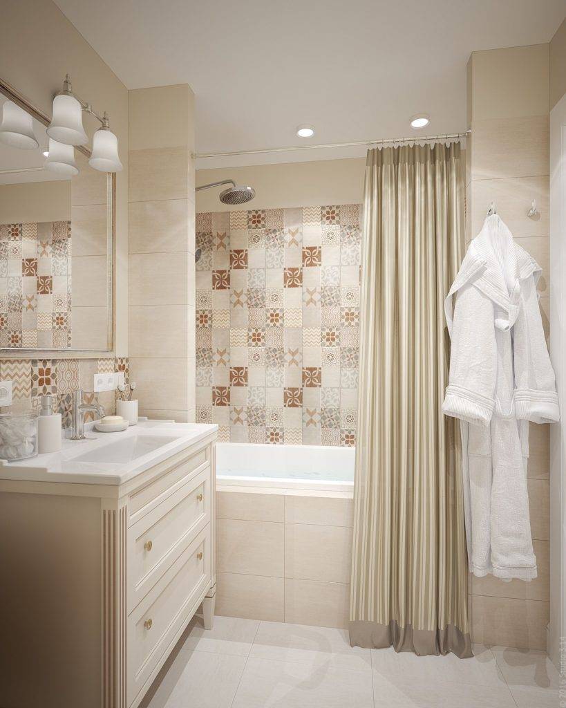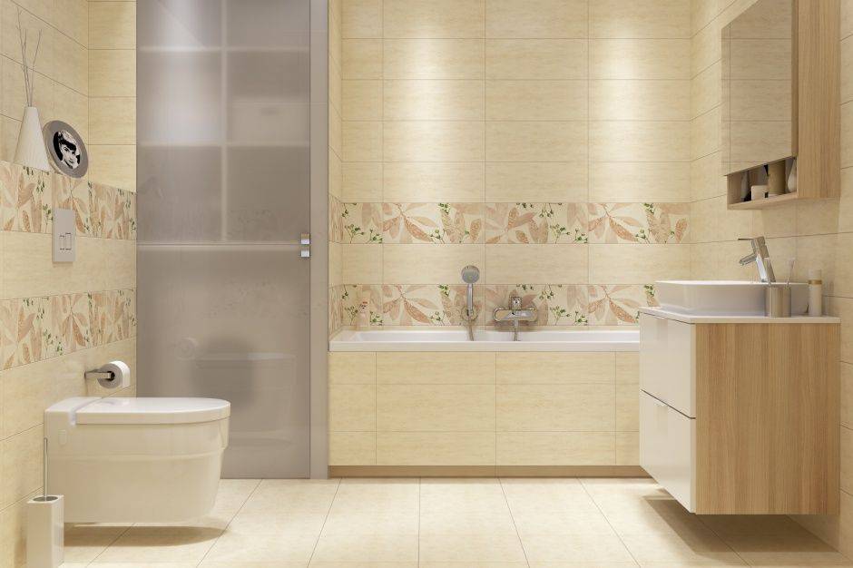 Традиционно для оформления ванной комнаты используют керамическую плитку. Она гигиенична и легка в уходе, к тому же представлена в широком ассортименте. Если взять два разных оттенка бежевого, то можно создать объемный эффект. Уместен будет ассиметричный орнамент. Плитку применяют как для стен, так и для пола, на ней не будут заметны следы от воды. Для небольших санузлов используют светлые тона плитки, чтобы зрительно расширить пространство. Затирку желательно использовать не белого цвета, а кремовую.