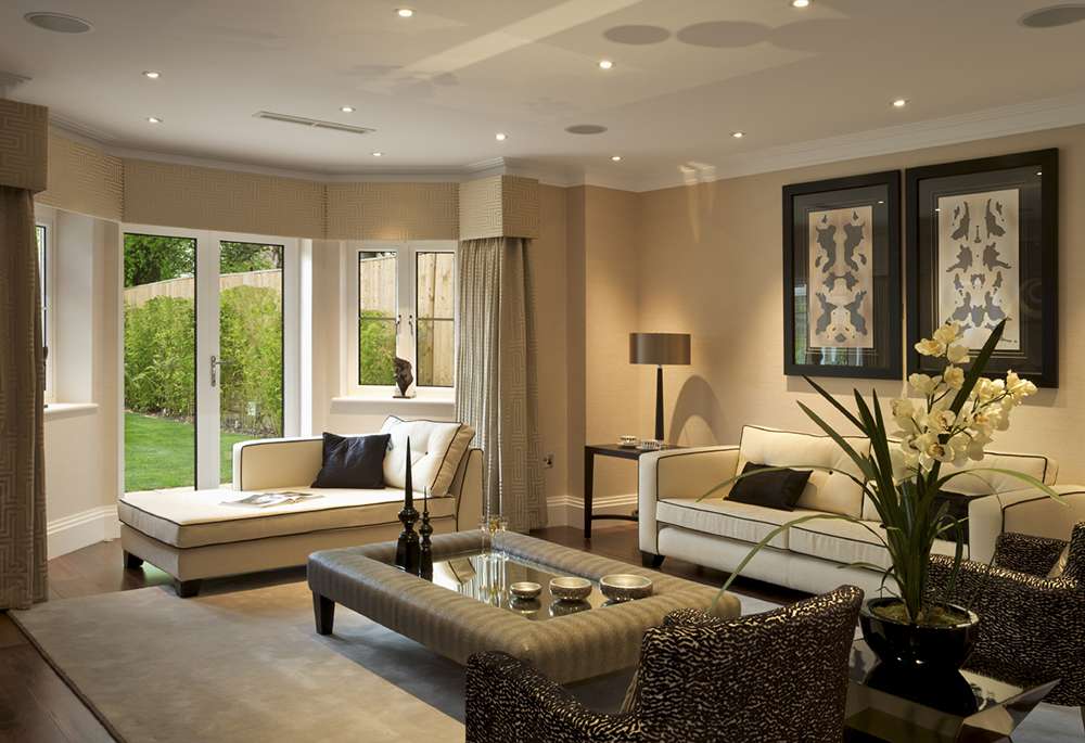 Для отделки стен гостиной комнаты используют не более двух оттенков бежевого. Для создания энергичного интерьера используют кремовый с красным или оранжевым, а для сдержанной гостиной идеально подойдут сочетания бежевого с серым или лиловым. Бежевый с розовым придадут мягкости и нежности, желтый наполнит помещение светом и теплом. Голубой используют для создания интерьера в бежевых тонах, если желают освежить помещение с окнами на юг.