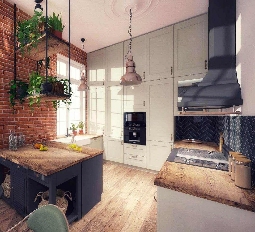 Понятно, что согласно этим пунктам, для небольших кухонь выгоднее светлая гамма и светлые «компаньоны» либо сочетание темных и светлых тонов (фото выше), но вы можете пойти еще дальше и создать выигрышные оптические иллюзии.