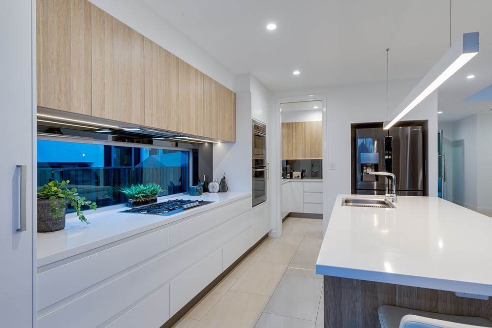 Белая кухня с отделкой цвета беж в стиле hi-tech.
