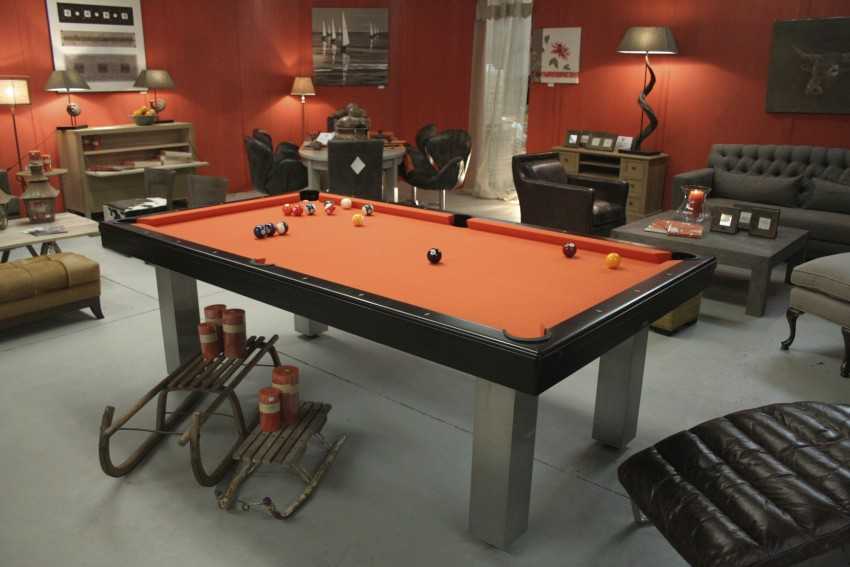 Игорный стол — это еще и элемент интерьера, поэтому его необходимо выполнять в стиле дизайна помещения. Также бывает так, что комната очень мала, и в ней должен поместиться не только стол для бильярда, но и вспомогательная мебель, то следует конструировать его разборным.