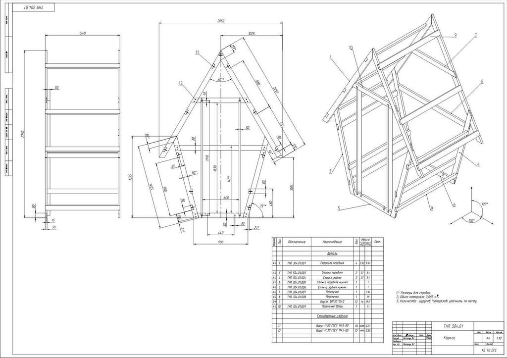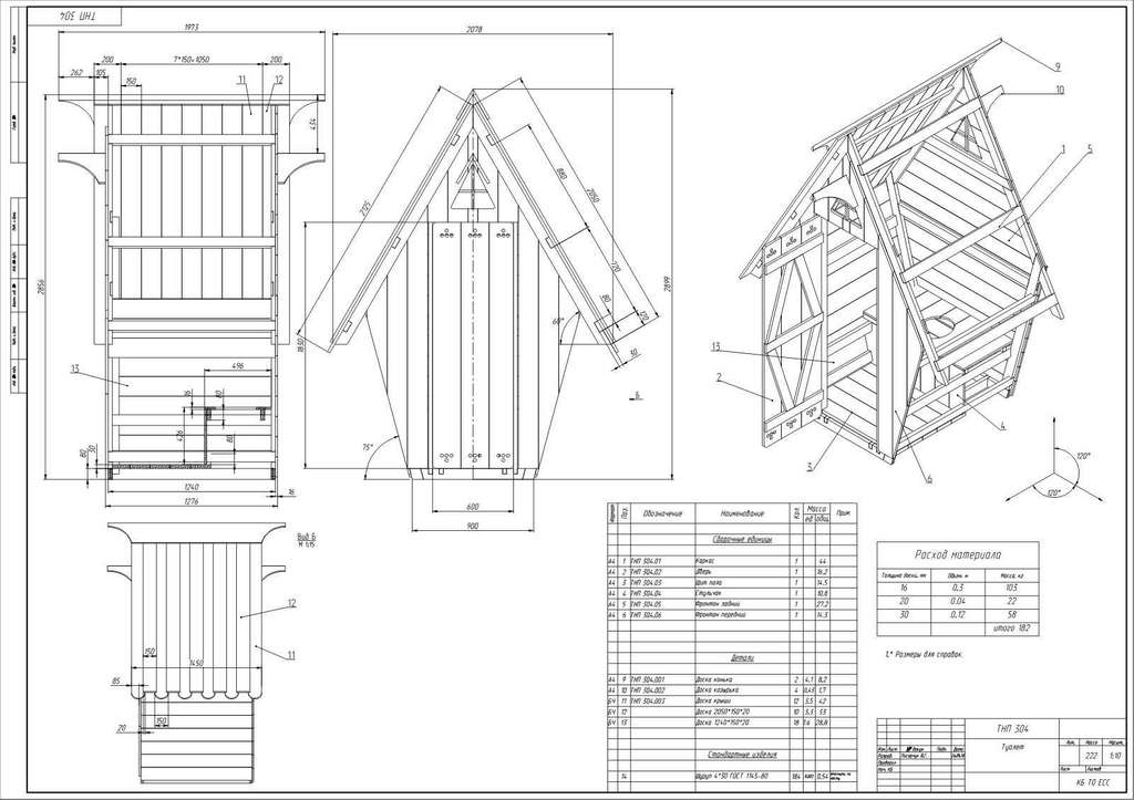 Затем строят каркас для стен и обрешетку крыши из обрезной доски (0,5×1 м).