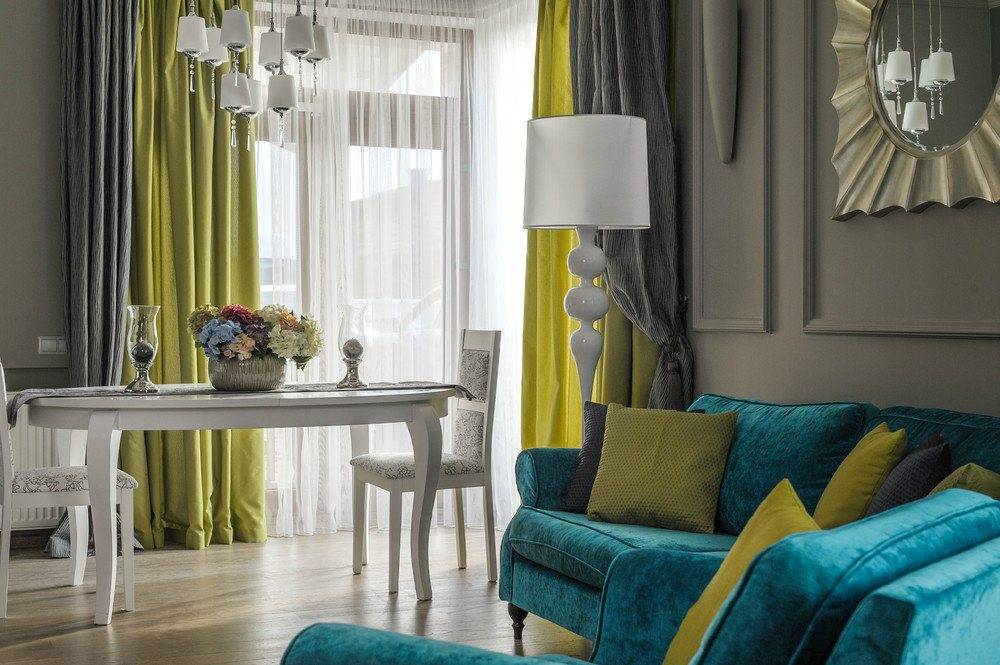 Желто-бирюзовые шторы выбирают для нейтрального интерьера. Занавеси станут ярким акцентом.