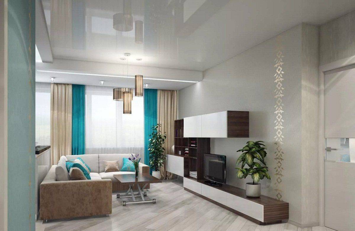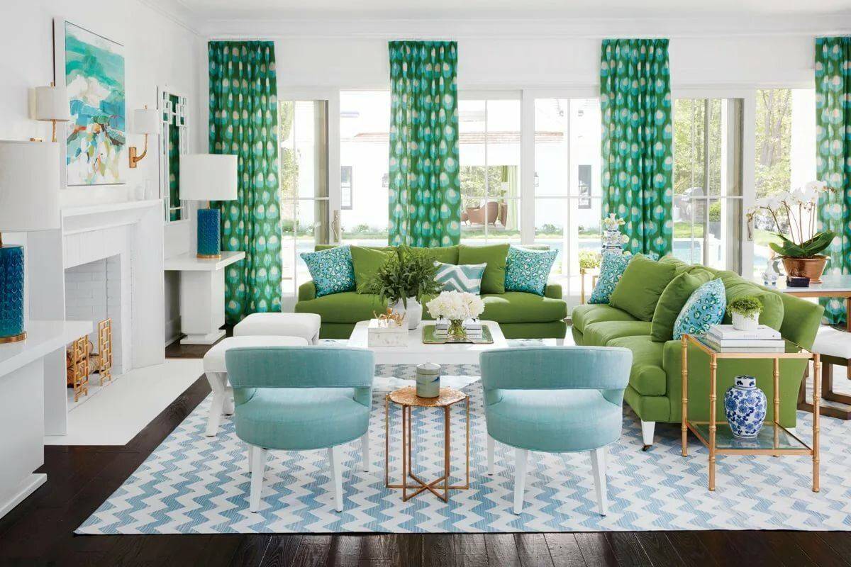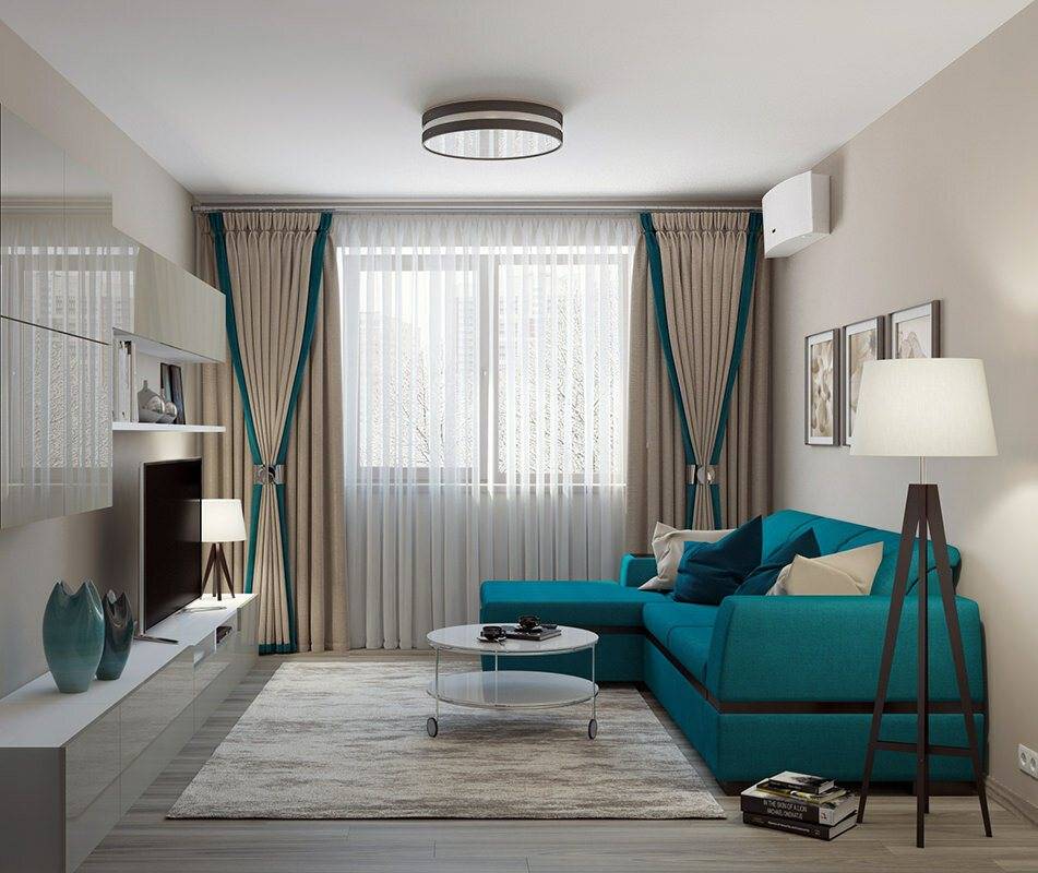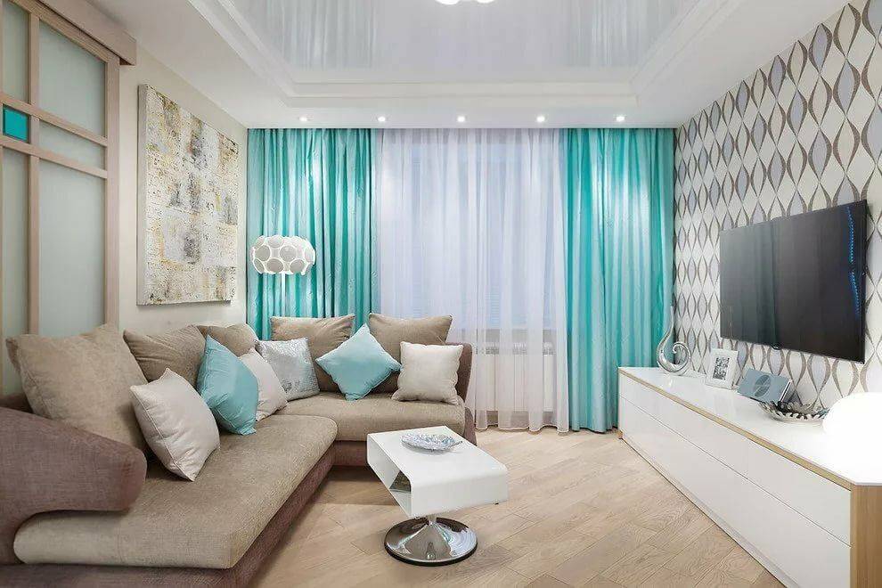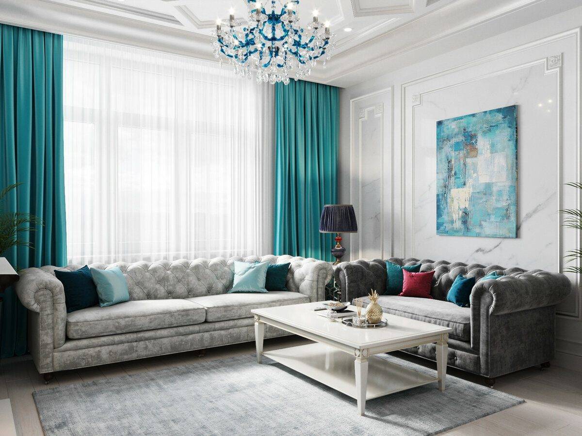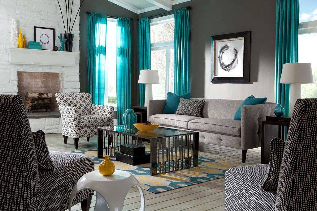 Гостиная с бирюзовыми шторами