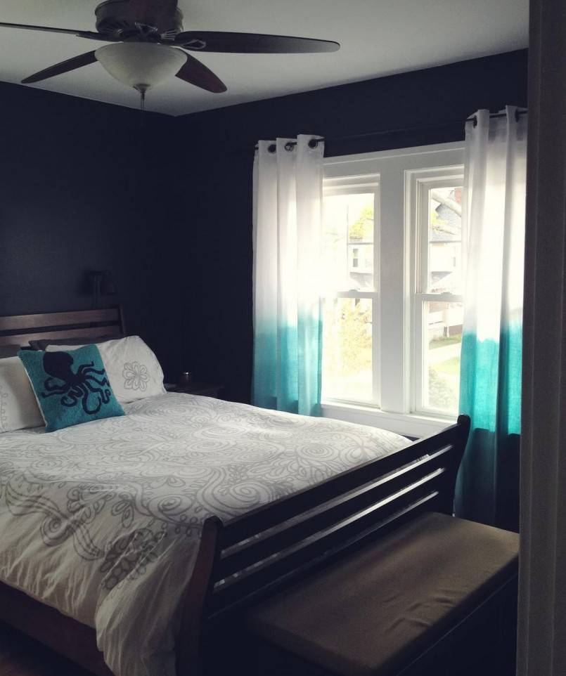 Бирюзовые шторы в интерьере спальни