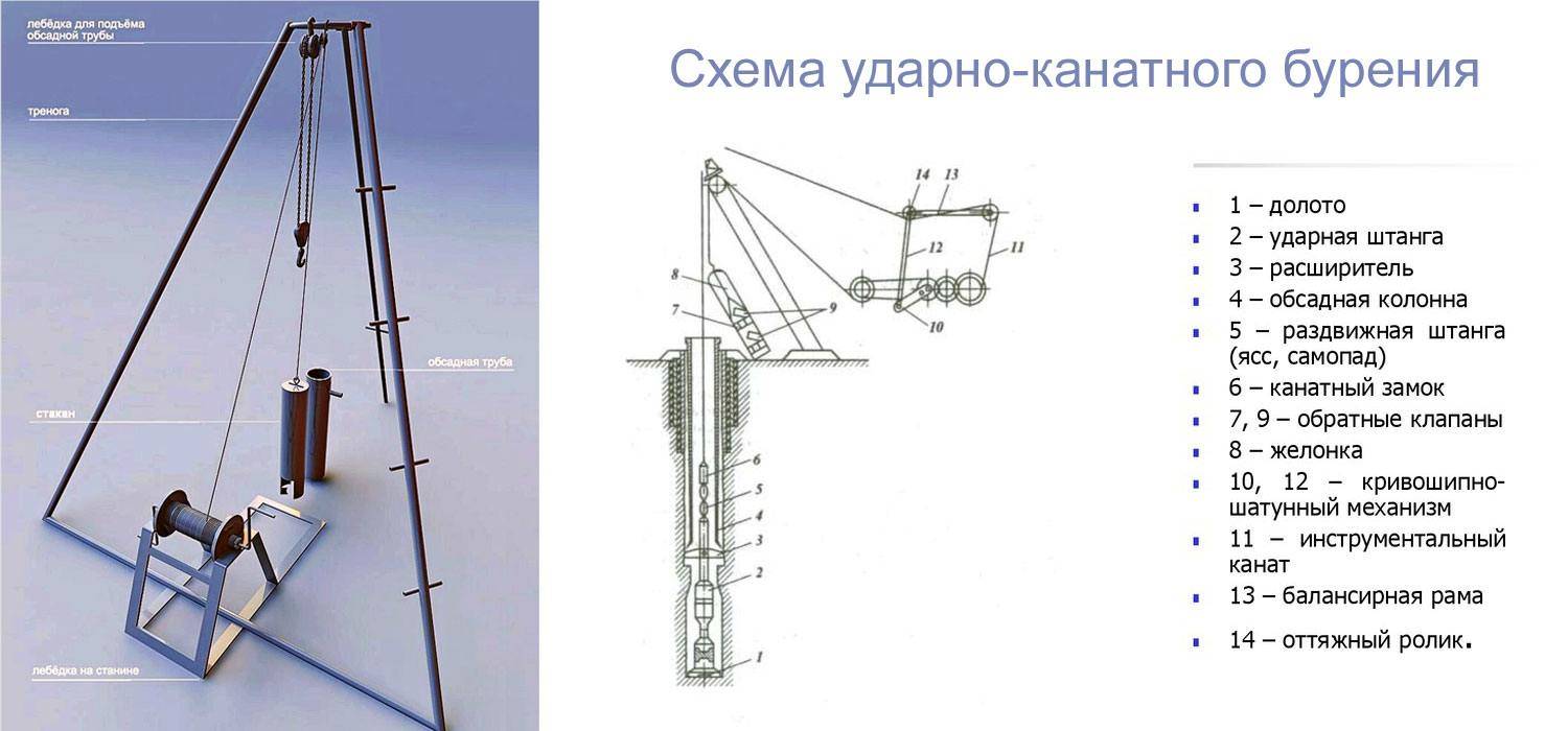 Наиболее часто используемый способ. Данный метод предполагает разбивание грунта посредством опускания с двухметровой высоты тяжелого бурового инструмента. Конструкция, используемая при таком виде бурения, состоит из элементов: