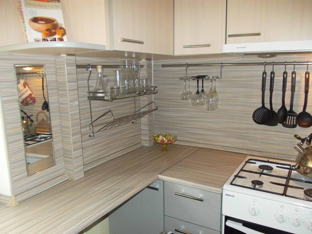 Доски для нарезки продуктов, ножи, полотенца, половники и другие столовые наборы можно повесить на крючок, который прикрепляется к фартуку. Также можно прибить к стене полку, где могут храниться стаканы, кружки и банки с крупами.