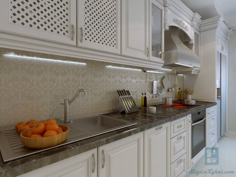 Панель с перфорацией особенно удачно будет смотреться под угловыми шкафами.