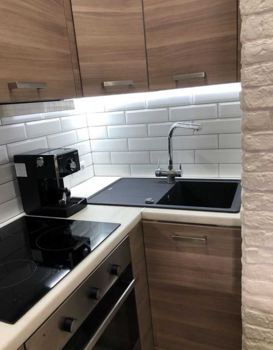 Зеркальный фартук станет настоящей изюминкой любой кухни. Он способен зрительно значительно увеличить помещение, поэтому это неплохой вариант для самых миниатюрных кухонь. Зеркало не боится влаги, да и высокие температуры, капли жира, моющие средства не способны причинить ему вред. Это очень оригинальный способ отделки, который преобразит кухню.