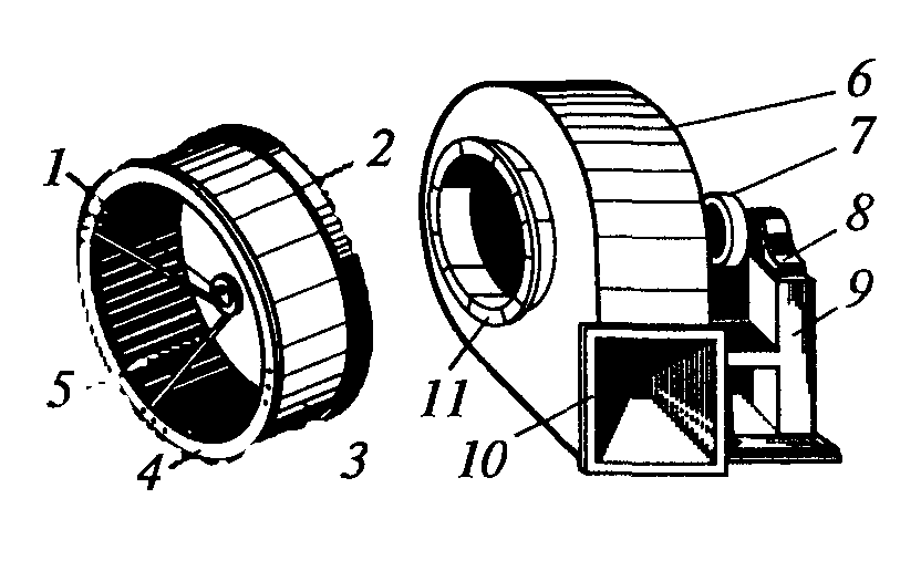 Схема элементов центробежного вентилятора: 1 – ступица, 2 – основной диск, 3 – рабочие лопатки, 4 – передний диск, 5 – лопастная решетка, 6 – корпус, 7 – шкив, 8 – подшипники, 9 – станина, 10, 11 – фланцы.