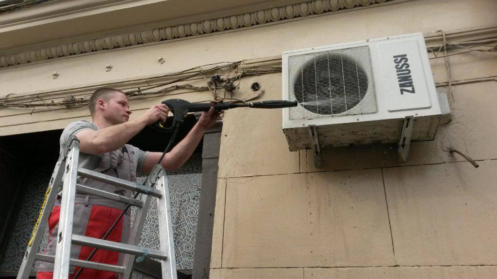Пожалуй, внешний блок чистить трудней всего, так как нередко он располагается в труднодоступных местах. К счастью, начищать его можно всего раз или два в год.