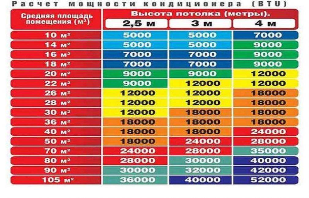 Легко рассчитать, что мощность кондиционера на 5000 BTU будет составлять около 1,5 кВт. На 7000 BTU – чуть больше 2 кВт, а на 9000 BTU – 2,6 кВт.