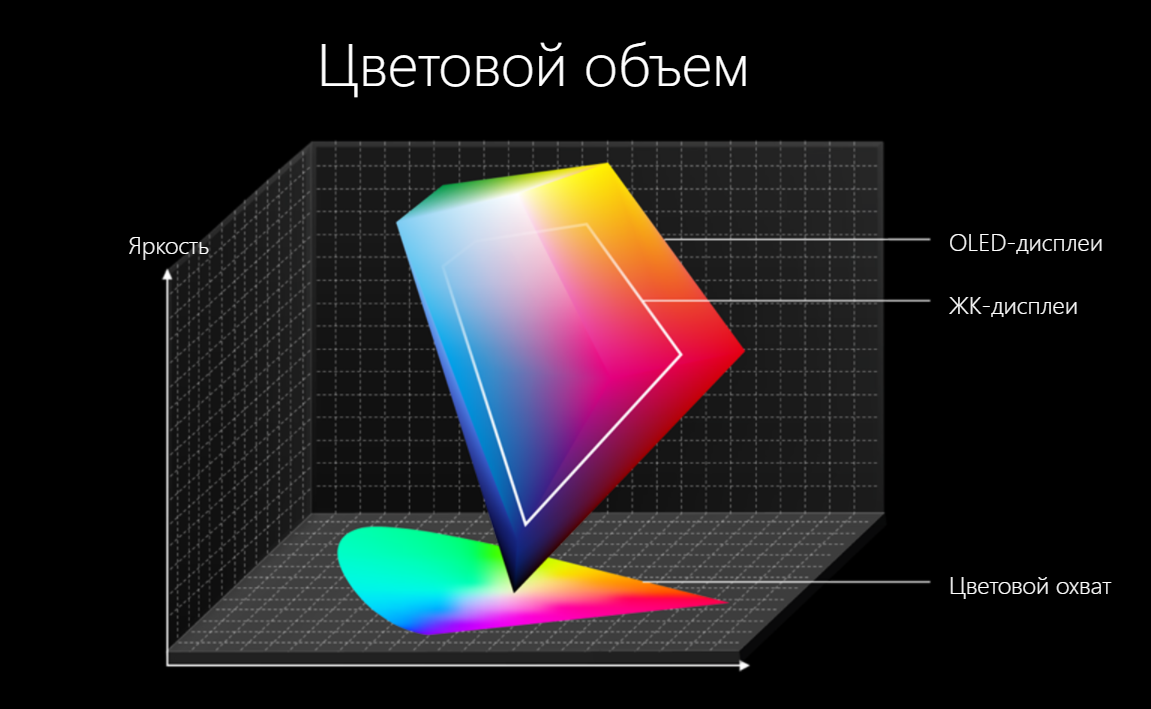 ОЛЕД матрицы обладают обширным спектром цветов и высокой контрастностью. Однако, несмотря на отличия светодиодной подсветки, именно QLED дисплеи являются лидерами по данному параметру.