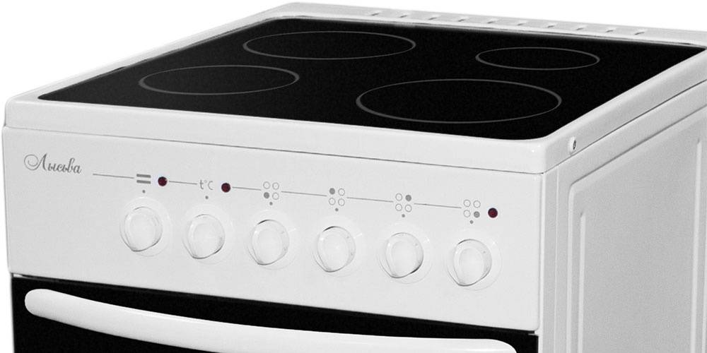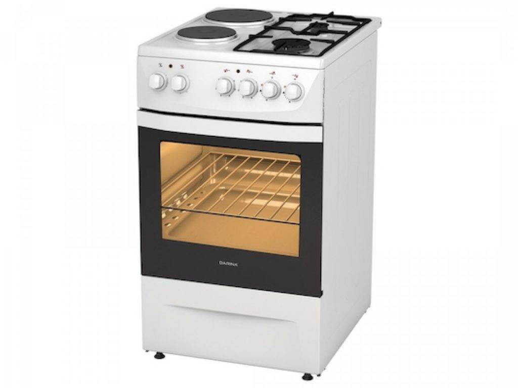 Средняя стоимость электрической модели 12,5 тыс. ₽, габариты 500х585х850 мм, духовка имеет объем 52 л, гриль, стекло двойное, внутренняя подсветка. Варочная поверхность — эмаль белого цвета, 4 конфорки.