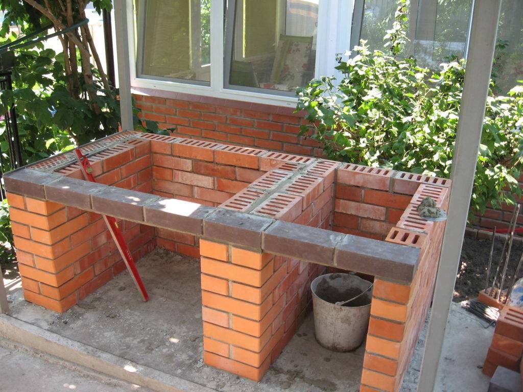 Следующий шаг – кладка. Сначала нужно приготовить раствор в пропорциях- песок : цемент – 4:1. Затем необходимо установить плиты под столешницу. Сразу стоит определиться с количеством решеток, выпилив выемку в кирпиче.