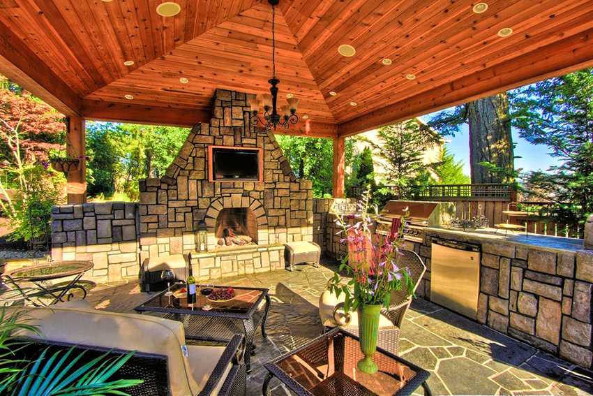 Нередко на каменном мангале готовятся и совершенно посторонние блюда или просто разогревается еда. Чтобы возле необычного арт-объекта с удовольствием собирались домочадцы и гости, нужно позаботиться о некоторых аспектах его обустройства и прежде всего, выбрать место.