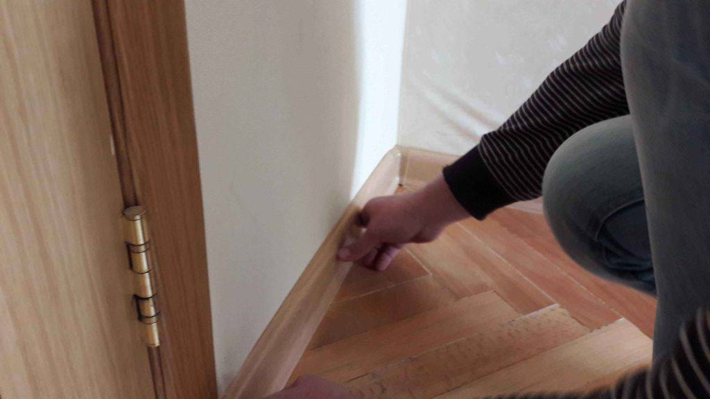 - подпиливают косяки и «заводят» в щель ламинированные панели;